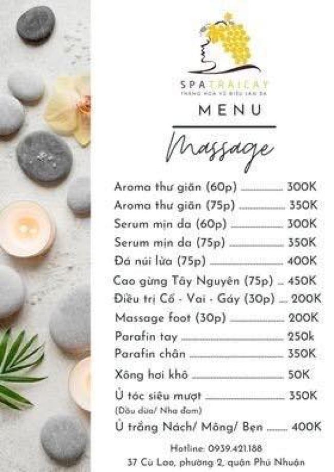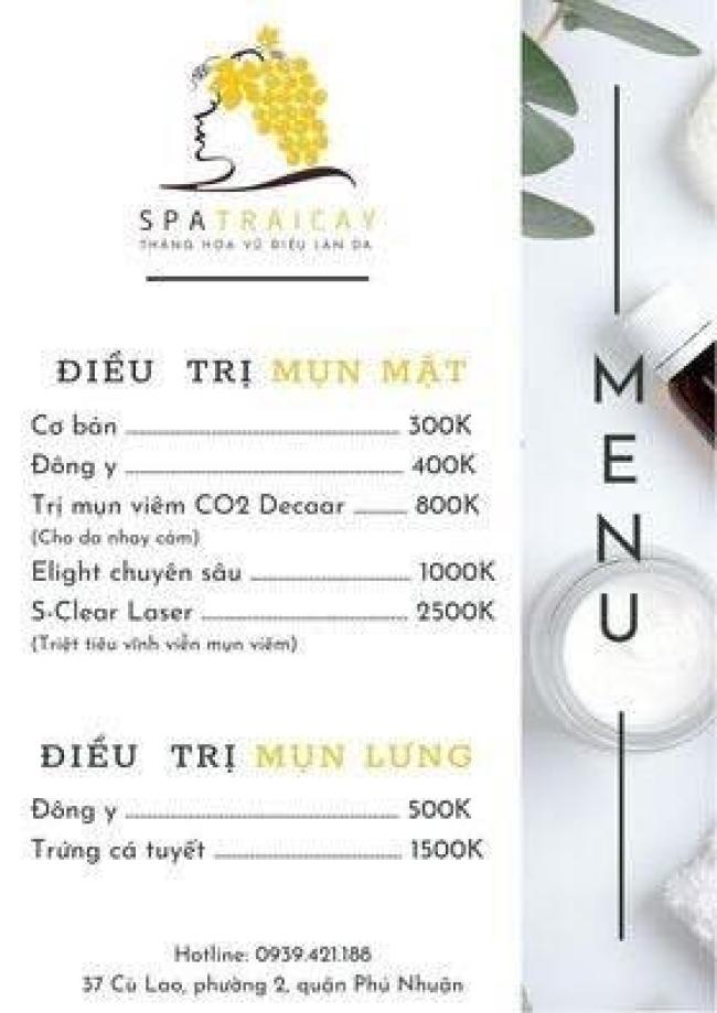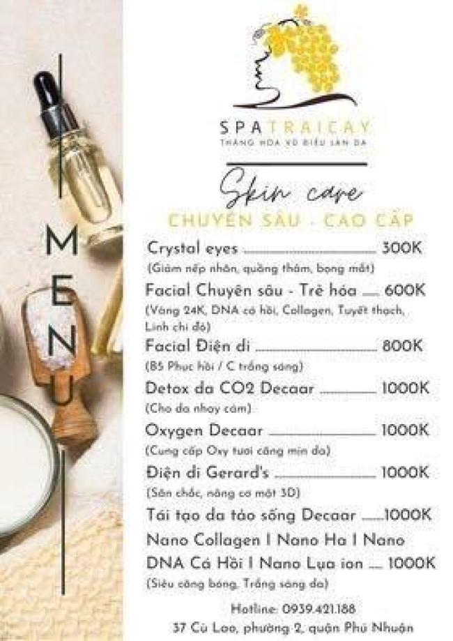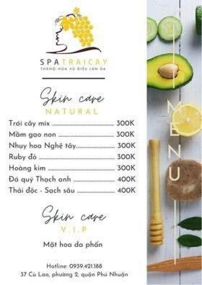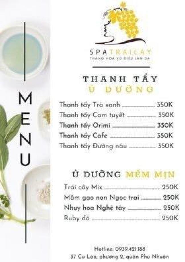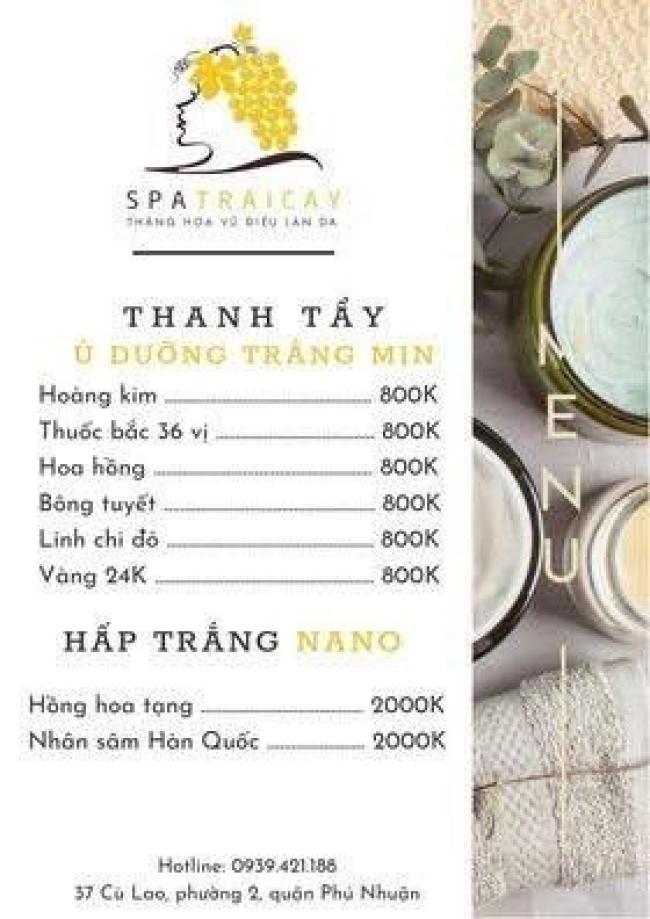 Spa Trái Cây là một trong những Spa đầu tiên sử dụng dược liệu thiên nhiên 100%, không sử dụng hóa chất độc hại trong các liệu trình làm đẹp. Với phong cách làm việc chuyên nghiệp, giàu kinh nghiệm, Spa là giải pháp an toàn để dưỡng da, làm trắng da một cách hoàn hảo dành cho bạn. Tọa lạc tại 177 Trương Định, Phường 9, Quận 3, TP.HCM, Spa Trái Cây sở hữu không gian làm đẹp hiện đại, sang trọng nhưng vô cùng thoáng mát, rộng rãi và ấm cúng. Dịch vụ làm đẹp đa dạng, hiện đại, chuyên nghiệp, đáp ứng đầy đủ tiêu chí khắt khe đảm bảo an toàn, mang đến cho khách hàng kết quả như ý nhất